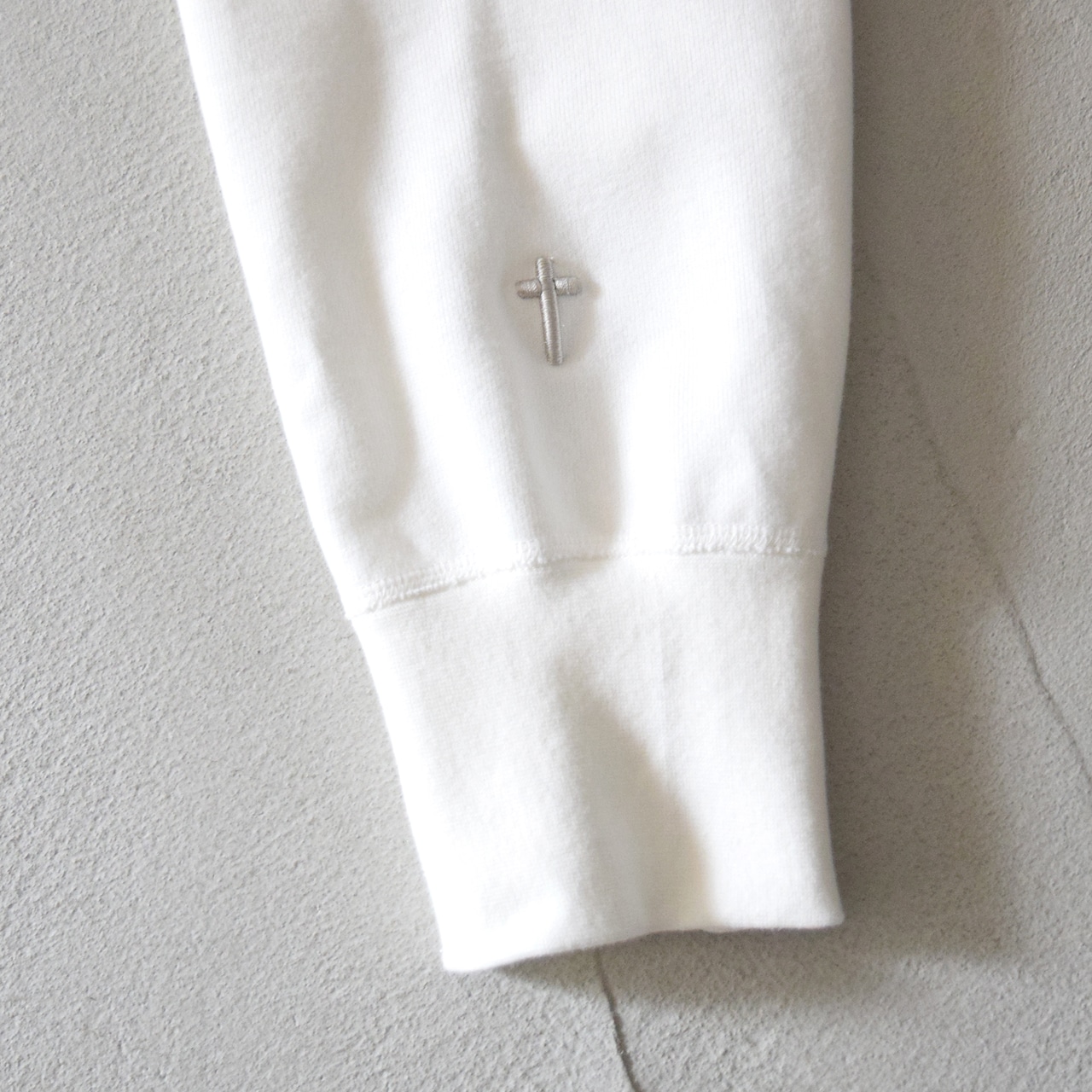 左袖口には立体感のある十字架の刺繍を施しています。原画を深く掘り下げ、そこからイメージを一新させ新たな価値を提案します。カジュアルに落とし込んだ着やすい最後の晩餐です。