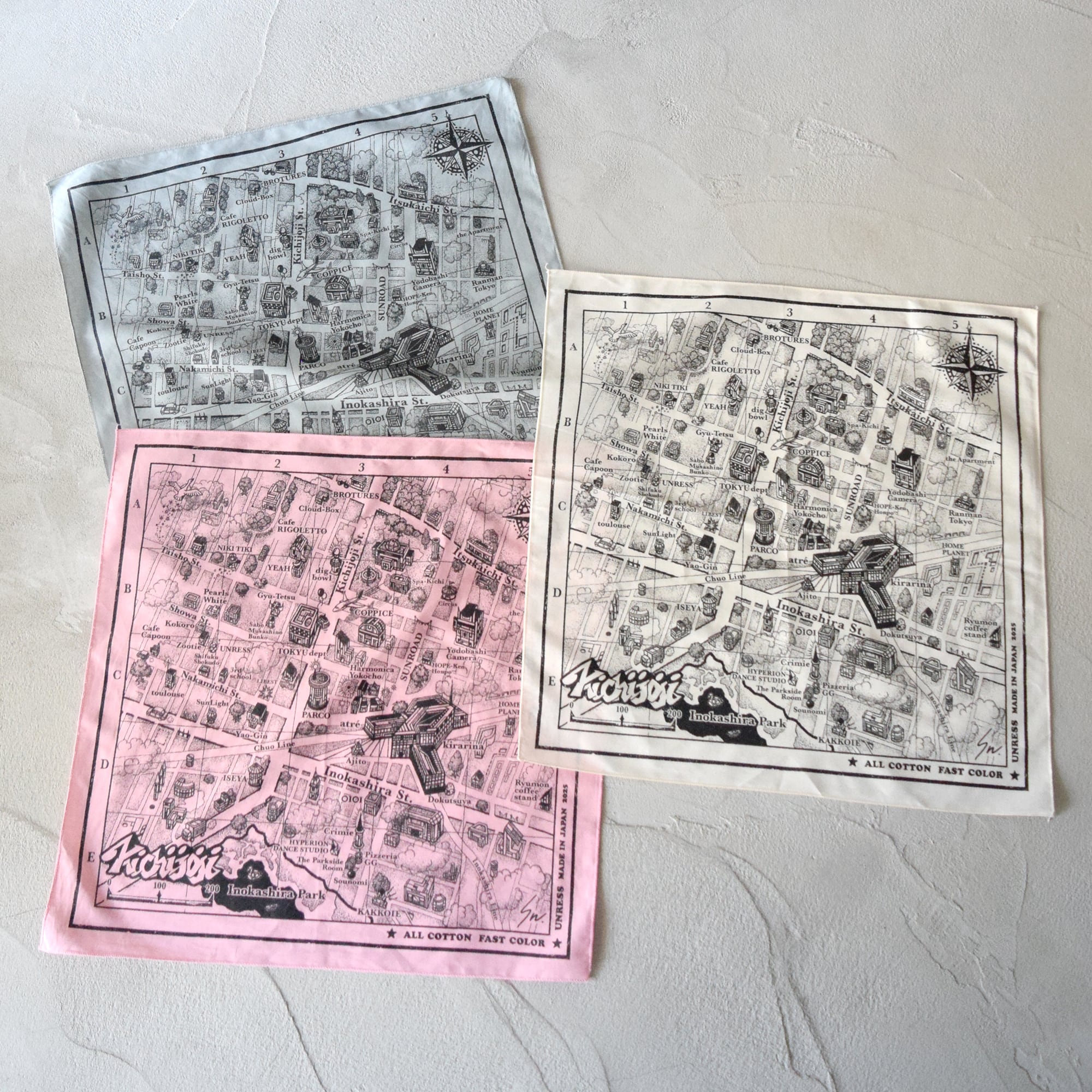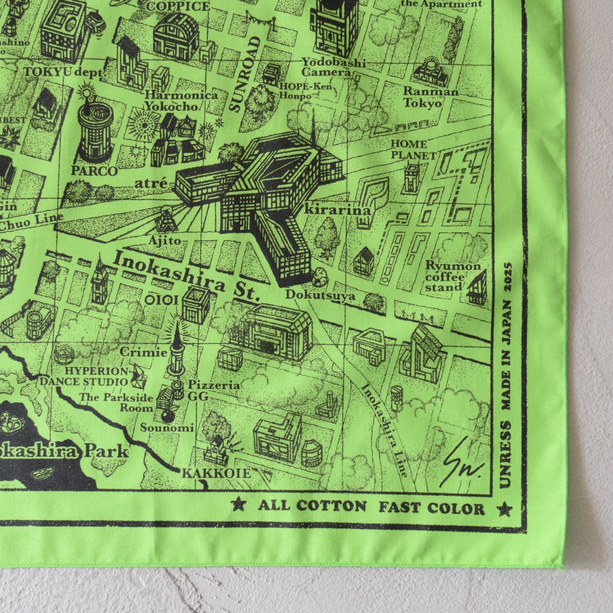 プリントはハイメッシュのシルクスクリーンで製作。使い込む毎に馴染んでいき良い風合いに育っていきます。吉祥寺散策のお供として、そして10年20年後もあの時はこんな感じだったなあと懐かしむ事の出来るバンダナです。