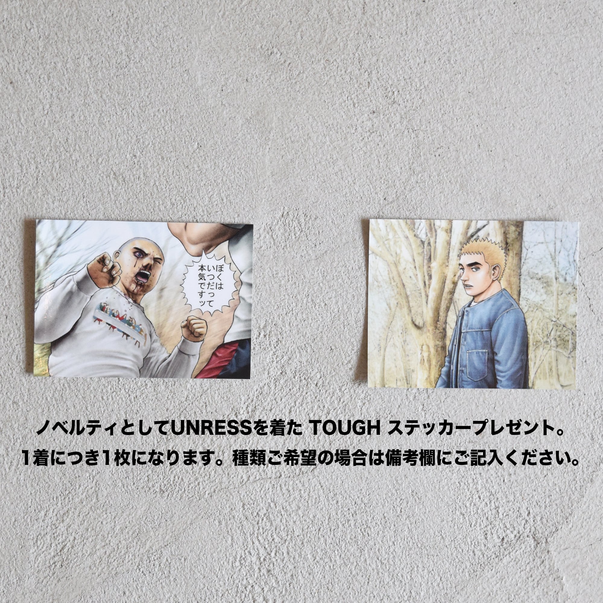 購入ノベルティとして、漫画「TOUGH」内に登場したUNRESSを着たキー坊&龍星ステッカーをプレゼント。(1着につき1枚になります。種類ご希望の場合は備考欄にご記入ください)