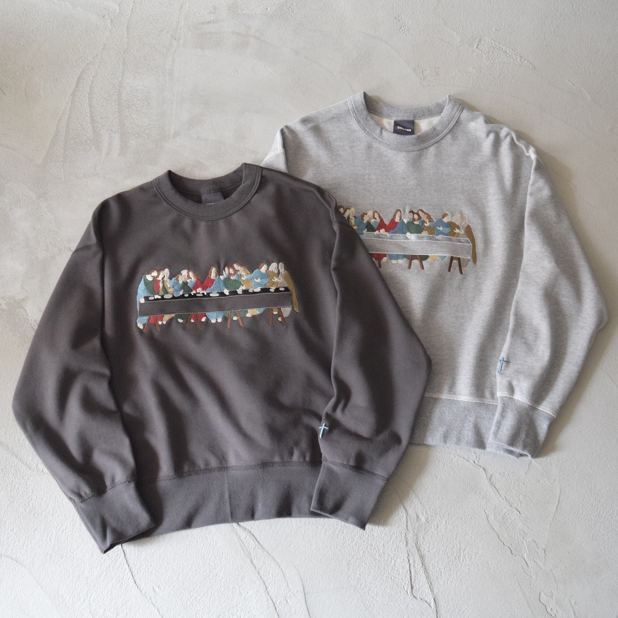 左袖口には立体感のある十字架の刺繍を施しています。原画を深く掘り下げ、そこからイメージを一新させ新たな価値を提案します。カジュアルに落とし込んだ着やすい最後の晩餐です。