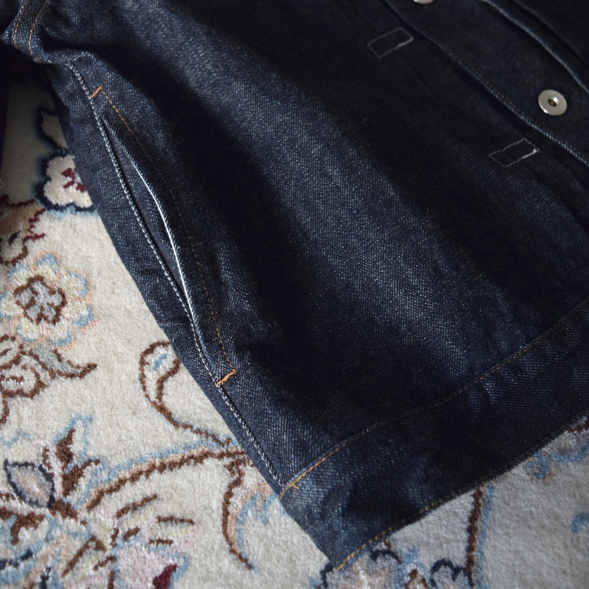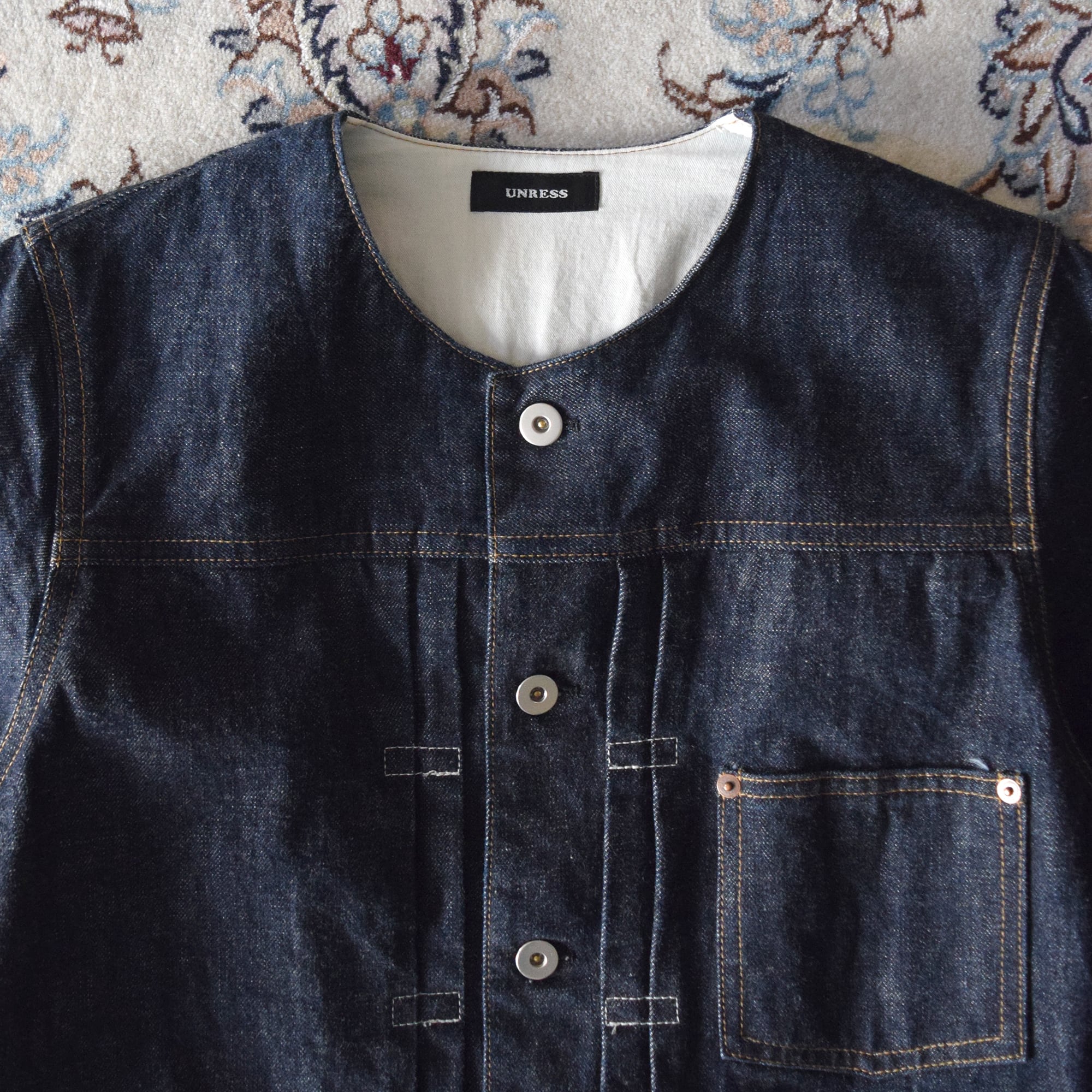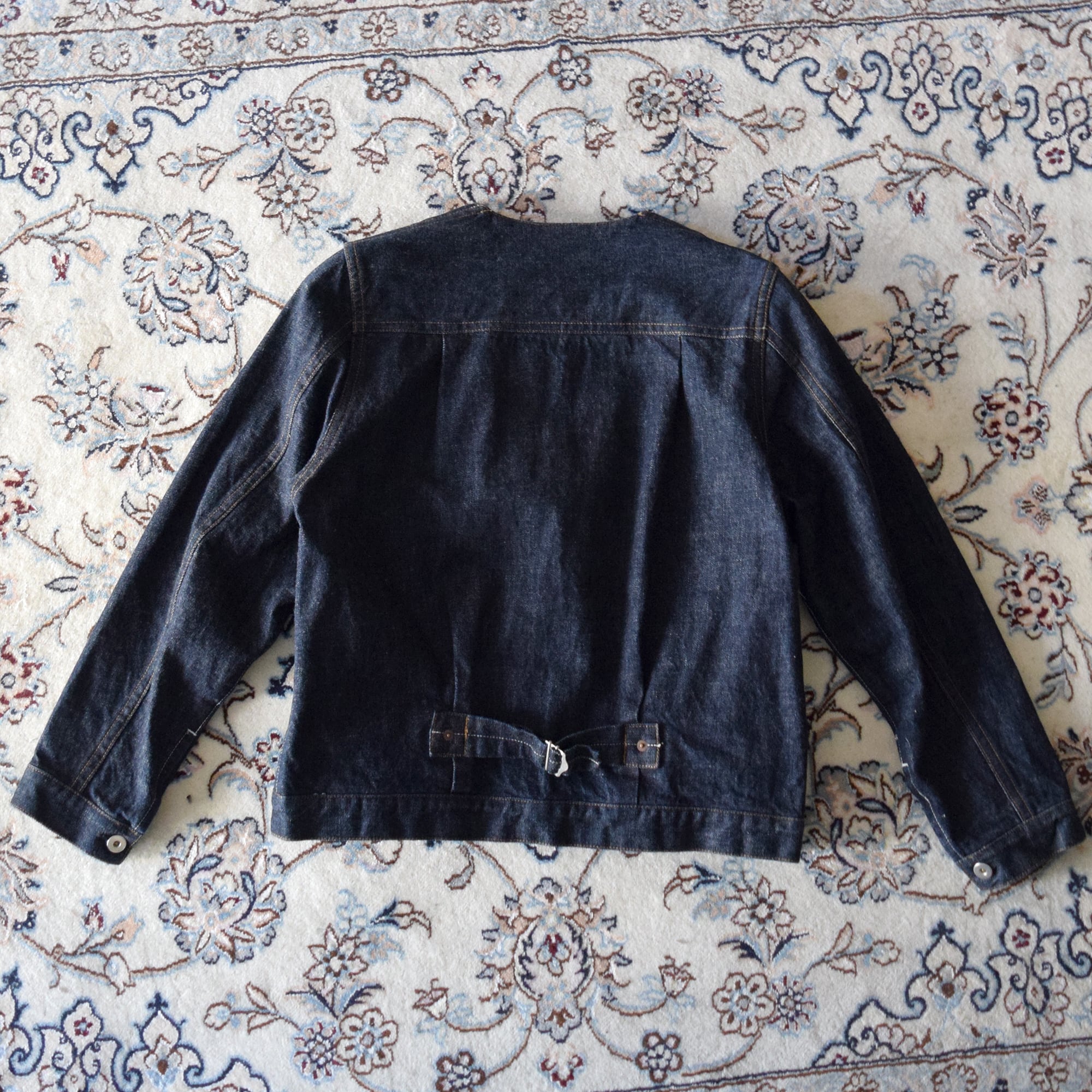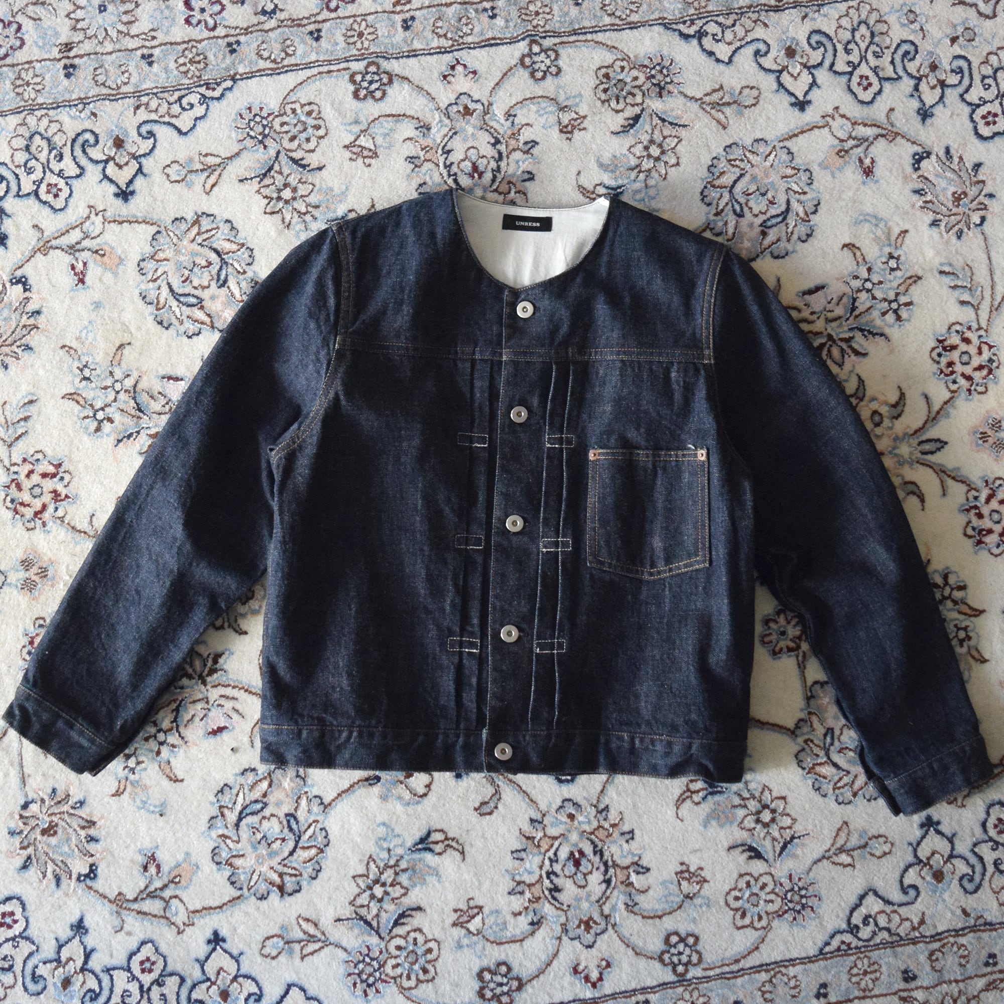 13.5ozのインディゴデニムを使用したノーカラーデニムジャケット。